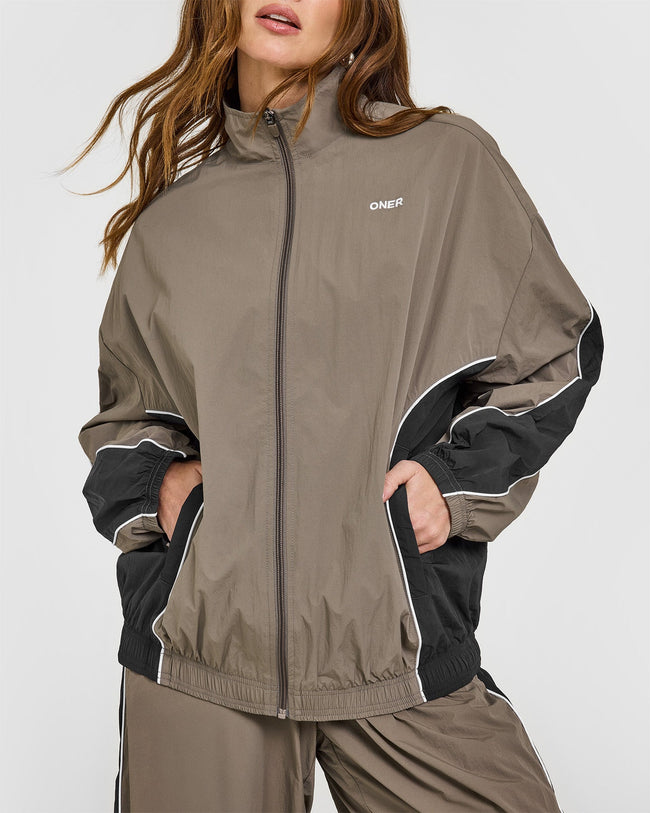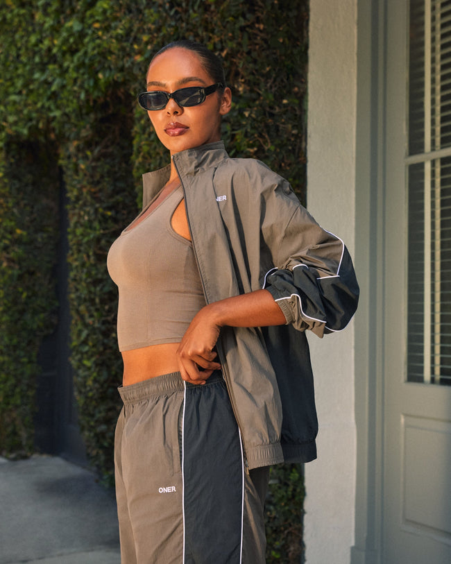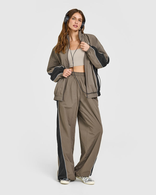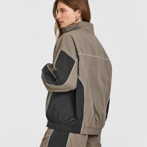 Oversized Piped Woven Track Jacket Moss Brown